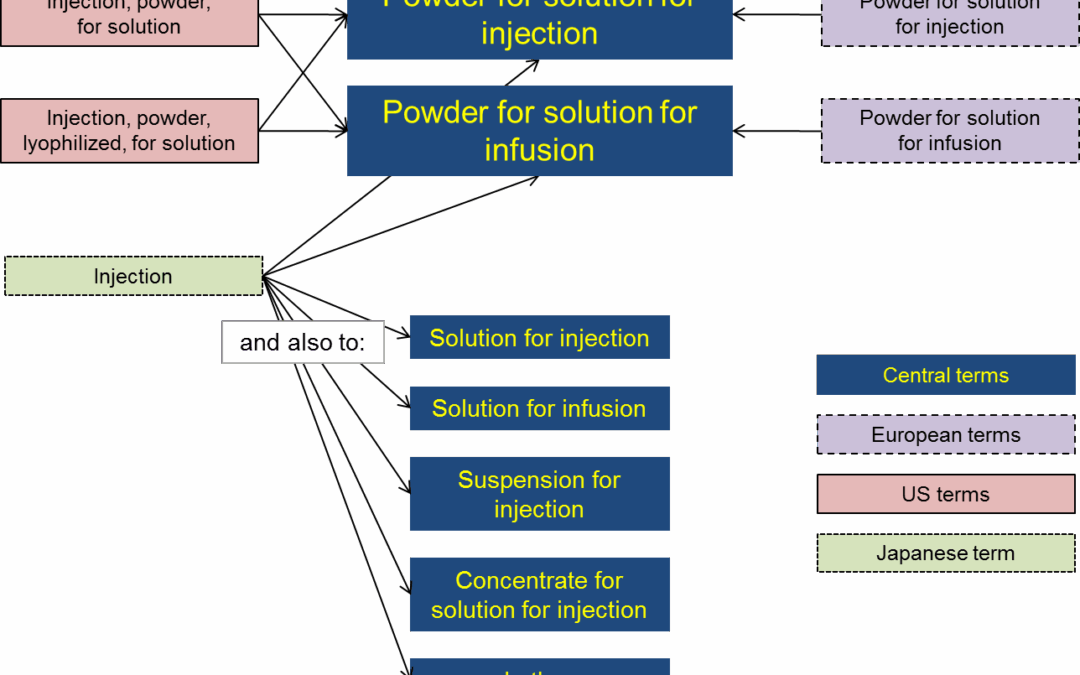 Powder for solution for injection and powder for solution for infusion there is one-to-one mapping for each European term, there is one-to-two mapping for each US term, and there is one-to-many mapping for the Japanese term.